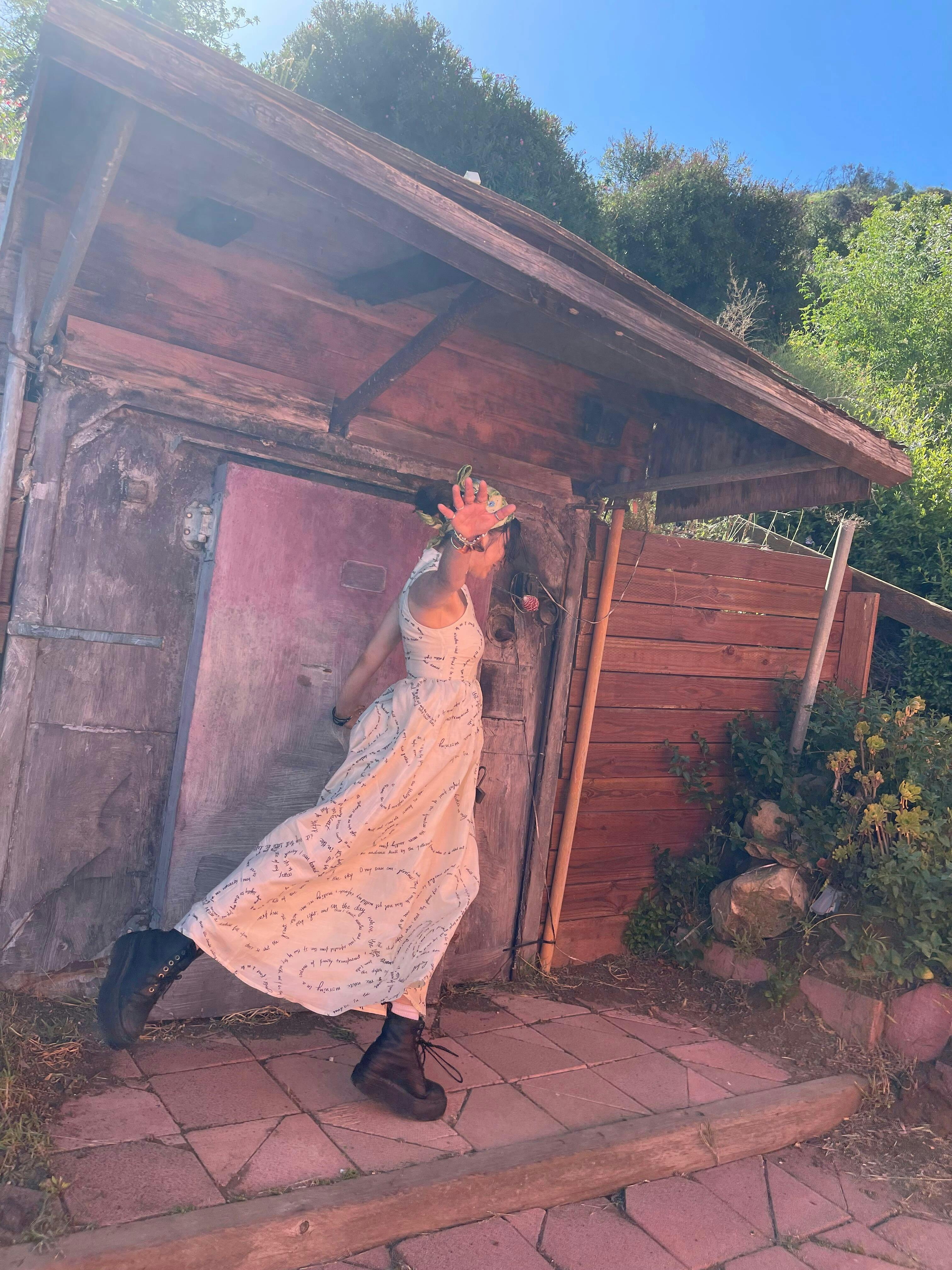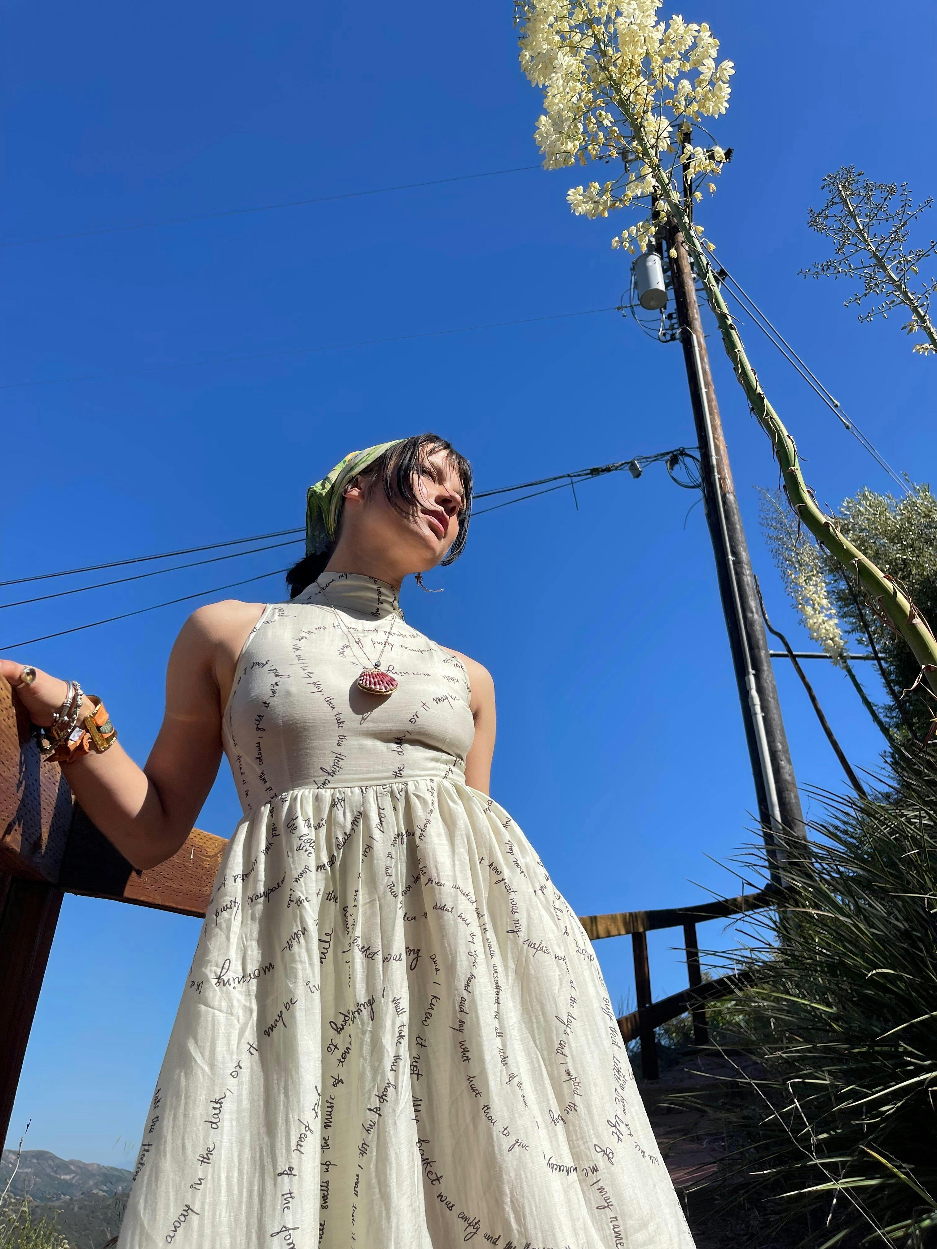 Step into sunshine with the playful Dandelion Dress—a breezy halter design crafted for movement and lightness. Made from ultra-soft cotton, it features a delicate inscription from Rabindranath Tagore’s “I Had Gone a-Begging from Door to Door,” serving as a gentle reminder that giving freely often brings the most significant rewards.